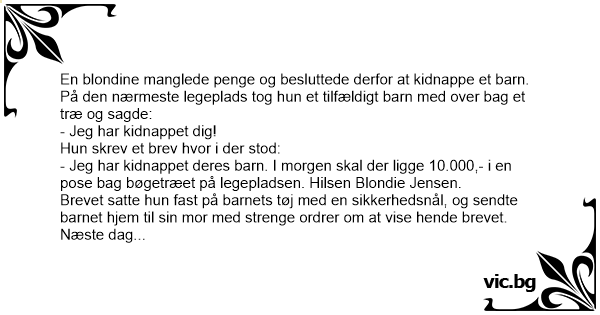 - Jeg har kidnappet deres barn. I morgen skal der ligge 10.000,- i en pose bag bøgetræet på legepladsen. Hilsen Blondie Jensen.