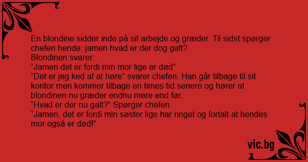 Blondinen kommer gråtende på jobb. Sjefen spør: - «Hva har skjedd?» «Moren min har dødd», svarer blondinen. Sjefen ber henne gå hjem, men hun sier det går greit. Senere på dagen finner sjefen henne...