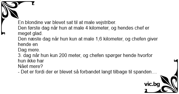 En mand fik job som vejmaler (en som maler striperne på vejen.) Første dag malede han 2km, andre dag 1km og tredje dag kun 500meter. Chefen spurgte: "Hvorfor går det langsommere og langsomere."...