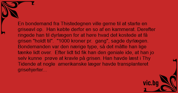 En bondemand fra Thistedegnen ville gerne til at starte en griseavl op. Han købte derfor en so af en kammerat. Derefter ringede han til dyrlægen for at høre hvad det kostede at få grisen "holdt til". "1000 kroner pr. gang", sagde dyrlægen.