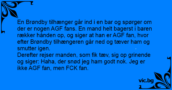 En Brøndby tilhænger går ind i en bar og spørger om der er nogen AGF fans. En mand helt bagerst i baren rækker hånden op, og siger at han er AGF fаn, hvor efter Brøndby tilhængeren går ned og tæver ham og smutter igen.
