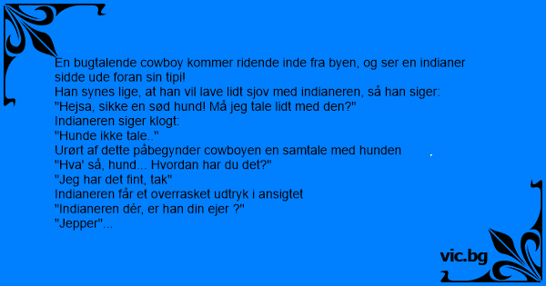 Een cowboy komt een dorpje binnen en ziet een indiaan aan de rand van zijn huis zitten. Cowboy: "Leuke hond heb je. Vind je het erg als ik met hem praat?" Indiaan: "Hond niet praten." Cowboy:...