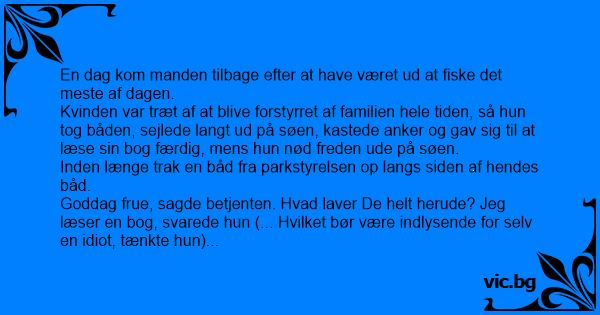 Goddag frue, sagde betjenten. Hvad laver De helt herude? Jeg læser en bog, svarede hun (... Hvilket bør være indlysende for selv en idiот, tænkte hun) De befinder Dem i et område, hvor fiskeri er forbudt, påpegede betjenten.