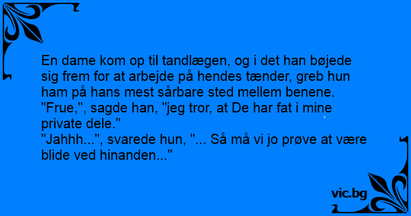 En dame kom op til tandlægen, og i det han bøjede sig frem for at arbejde på hendes tænder, greb hun ham på hans mest sårbare sted mellem benene.
