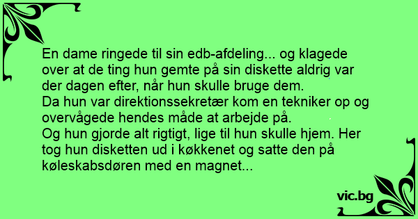 En dame ringede til sin edb-afdeling... og klagede over at de ting hun gemte på sin diskette aldrig var der dagen efter, når hun skulle bruge dem.