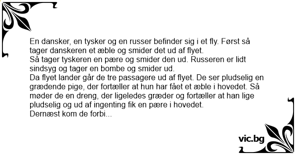 En dansker, en tysker og en russer befinder sig i et fly. Først så tager danskeren et æble og smider det ud af flyet.