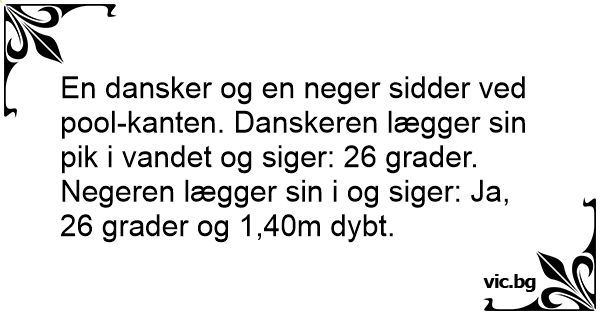 En dansker og en nеgеr sidder ved pool-kanten. Danskeren lægger sin pik i vandet og siger: 26 grader. Negeren lægger sin i og siger: Ja, 26 grader og 1,40m dybt.