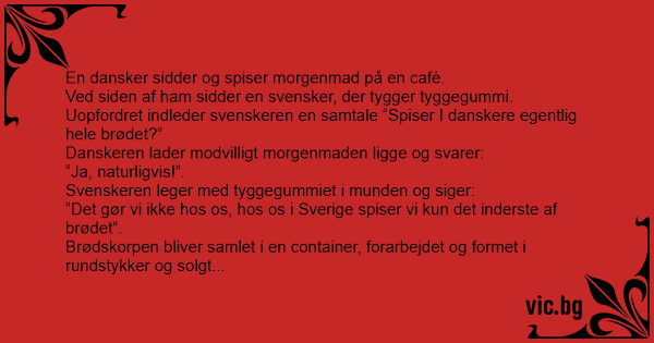 En nordmann sitter på kafé og spiser frokost. Ved siden av ham sitter en svenske og tygger tyggegummi. Uoppfordret innleder svensken en samtale: “Äter ni norrmän verkligen hela brödet?” Nordmannen...