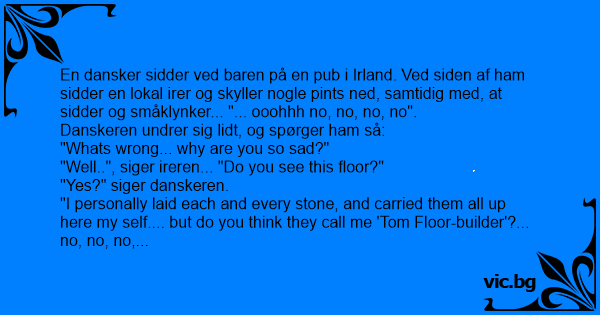 En dansker sidder ved baren på en pub i Irland. Ved siden af ham sidder en lokal irer og skyller nogle pints ned, samtidig med, at sidder og småklynker... "... ooohhh no, no, no, no".