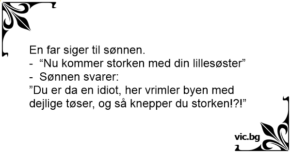 Pappan till sonen: - Snart kommer storken med ett litet syskon till dig. Sonen: - Jäkla pucko! Hela stan är full av brudar, och du sätter på en stork!