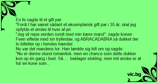 "Fordi I har været sådant et eksemplarisk gift par i 35 år, skal jeg opfylde et ønske til hver af jer.