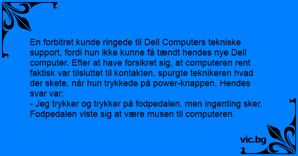 En forbitret kunde ringede til Dell Computers tekniske support, fordi hun ikke kunne få tændt hendes nye Dell computer. Efter at have forsikret sig, at computeren rent faktisk var tilsluttet til kontakten, spurgte teknikeren hvad der skete, når hun trykkede på power-knappen. Hendes svar var: