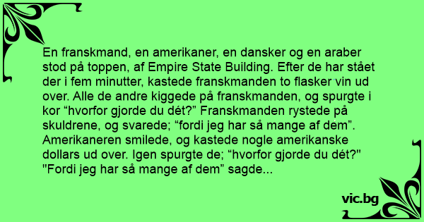 En franskmand, en amerikaner, en dansker og en araber stod på toppen, af Empire State Building. Efter de har stået der i fem minutter, kastede franskmanden to flasker vin ud over. Alle de andre kiggede på franskmanden, og spurgte i kor “hvorfor gjorde du dét?” Franskmanden rystede på skuldrene, og svarede; “fordi jeg har så mange af dem”. Amerikaneren smilede, og kastede nogle amerikanske dollars ud over. Igen spurgte de; “hvorfor gjorde du dét?"