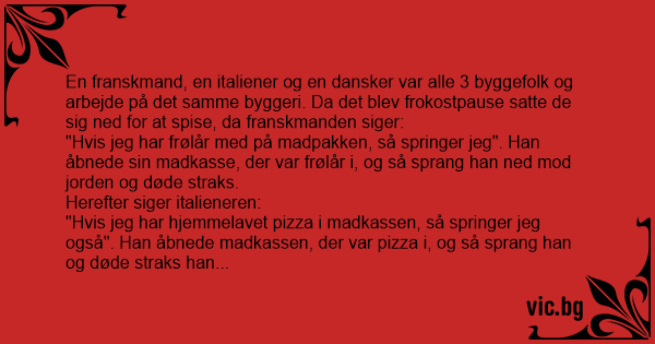 En franskmand, en italiener og en dansker var alle 3 byggefolk og arbejde på det samme byggeri. Da det blev frokostpause satte de sig ned for at spise, da franskmanden siger: