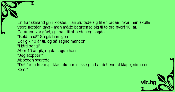 En franskmand gik i kloster. Han sluttede sig til en orden, hvor man skulle være næsten tavs - man måtte begrænse sig til to ord hvert 10. år.