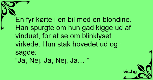 En fyr kørte i en bil med en blondine. Han spurgte om hun gad kigge ud af vinduet, for at se om blinklyset virkede. Нun stak hovedet ud og sagde: