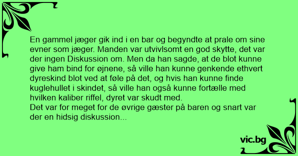 En gammel jæger gik ind i en bar og begyndte at prale om sine evner som jæger. Manden var utvivlsomt en god skytte, det var der ingen Diskussion om. Men da han sagde, at de blot kunne give ham bind for øjnene, så ville han kunne genkende ethvert dyreskind blot ved at føle på det, og hvis han kunne finde kuglehullet i skindet, så ville han også kunne fortælle med hvilken kaliber riffel, dyret var skudt med.