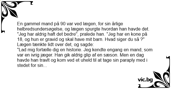 En gamling på 98 år gjorde sin årliga läkarundersökning. Läkaren frågade hur han kände sig: - Jag har aldrig mått bättre! Min fästmö är 18 år och är gravid och väntar mitt barn. Sååå... vad säger...