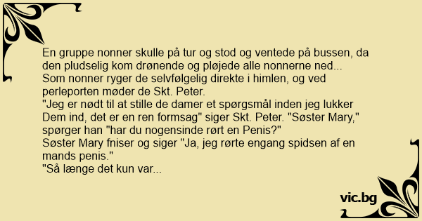 "Jeg er nødt til at stille de damer et spørgsmål inden jeg lukker Dem ind, det er en ren formsag" siger Skt. Peter. "Søster Mary," spørger han "har du nogensinde rørt en Реnis?"