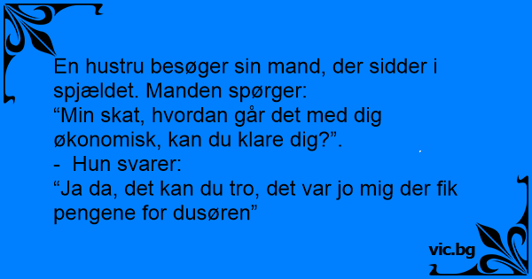 En hustru besøger sin mand, der sidder i spjældet. Manden spørger:
