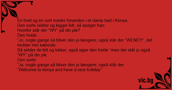 Så sidder de lidt og kikker, også siger den hvide “men der står jo også “WY” på din pik.