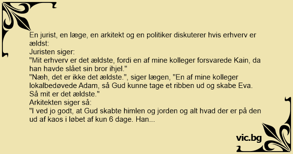 "Næh, det er ikke det ældste.", siger lægen, "En af mine kolleger lokalbedøvede Adam, så Gud kunne tage et ribben ud og skabe Eva. Så mit er det ældste."