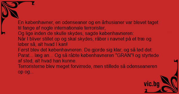 Terroristerne blev meget forvirrede, men stillede så odenseaneren op og sagde de: Parat... læg an... Og så råbte odenseaneren "BØG"!, hvorefter også han løb