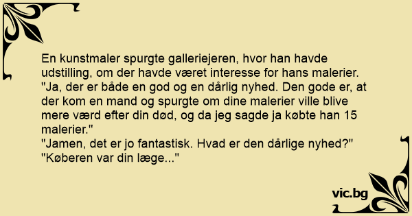 "Ja, der er både en god og en dårlig nyhed. Den gode er, at der kom en mand og spurgte om dine malerier ville blive mere værd efter din død, og da jeg sagde ja købte han 15 malerier."