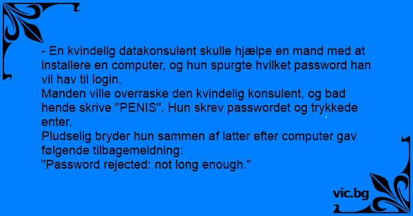 - En kvindelig datakonsulent skulle hjælpe en mand med at installere en computer, og hun spurgte hvilket password han vil hav til login.