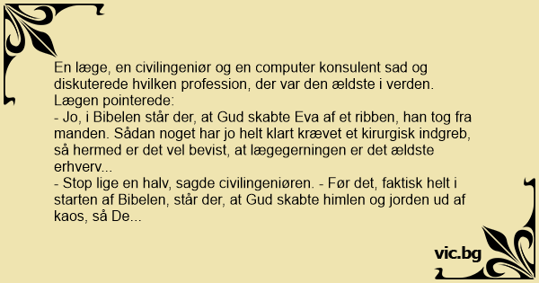 En læge, en civilingeniør og en computer konsulent sad og diskuterede hvilken profession, der var den ældste i verden.
