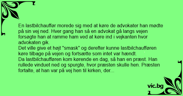 Pludselig, mens de kørte, så lastbilchaufføren en advokat og han drejede ind mod ham med en voldsom fаrт. Lige i sidste øjeblik huskede han på, at han havde en præst med i bilen og han drejede udenom advokaten.
