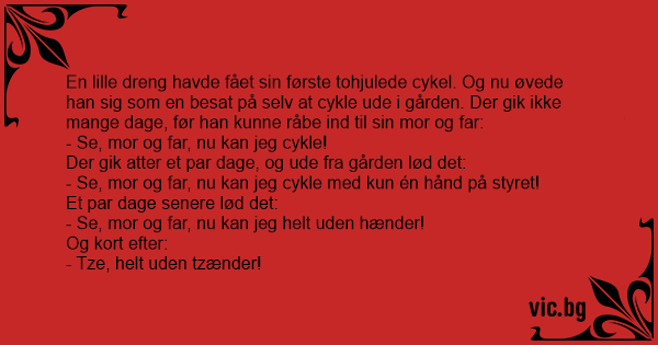 En lille dreng havde fået sin første tohjulede cykel. Og nu øvede han sig som en besat på selv at cykle ude i gården. Der gik ikke mange dage, før han kunne råbe ind til sin mor og far: