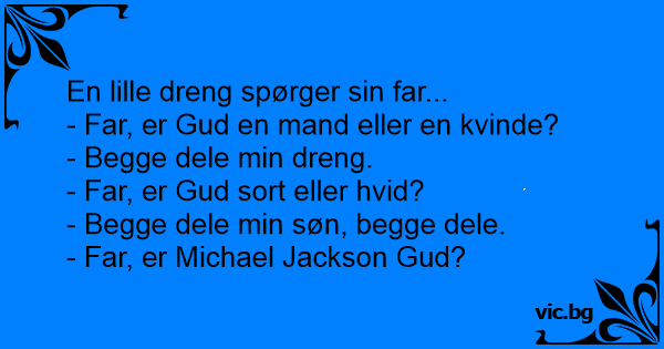- Pappa, er Gud mann eller kvinne, spurte guttungen. - Begge deler. - Er han svart eller hvit? - Begge deler. Gutten tenkte seg om før han spør: - Er det Michael Jackson?