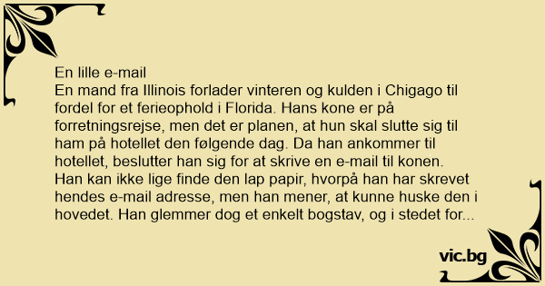 Han kan ikke lige finde den lap papir, hvorpå han har skrevet hendes e-mail adresse, men han mener, at kunne huske den i hovedet. Han glemmer dog et enkelt bogstav, og i stedet for at blive sendt til konen bliver den sendt til en ældre dame, der netop dagen forinden er blevet enke.