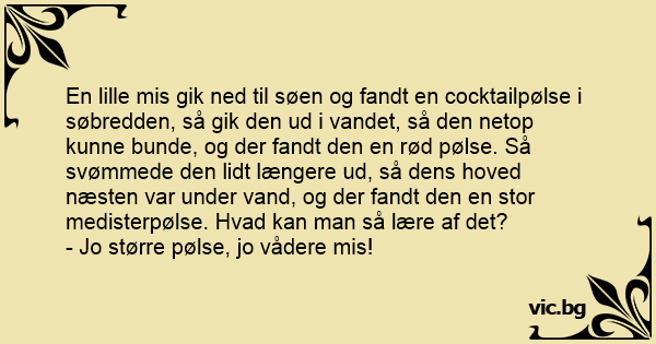 En lille mis gik ned til søen og fandt en cocktailpølse i søbredden, så gik den ud i vandet, så den netop kunne bunde, og der fandt den en rød pølse. Så svømmede den lidt længere ud, så dens hoved næsten var under vand, og der fandt den en stor medisterpølse. Hvad kan man så lære af det?