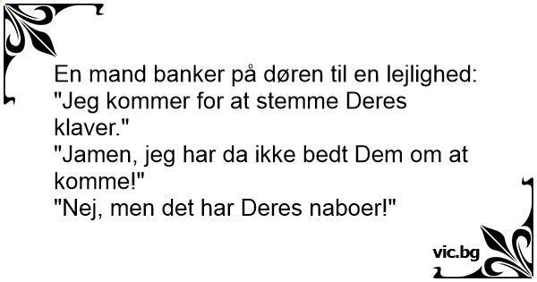 Er komt een pianostemmer bij meneer Jansen. Meneer Jansen: "Ik heb helemaal geen pianostemmer besteld!" De pianostemmer: "Nee, maar de buren wel."