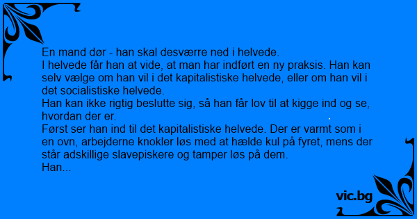 I helvede får han at vide, at man har indført en ny praksis. Han kan selv vælge om han vil i det kapitalistiske helvede, eller om han vil i det socialistiske helvede.