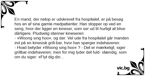 - »Woong sing hoo«, og dør. Vel ude fra hospitalet går manden ind på en kinesisk grill-bar, hvor han spørger indehaveren: