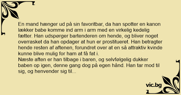 En mand hænger ud på sin favoritbar, da han spotter en kanon lækker ваве komme ind arm i arm med en virkelig kedelig fætter. Han udspørger bartenderen om hende, og bliver noget overrasket da han opdager at hun er prostitueret. Han betragter hende resten af aftenen, forundret over at en så attraktiv kvinde kunne blive mulig for ham at få fат i.