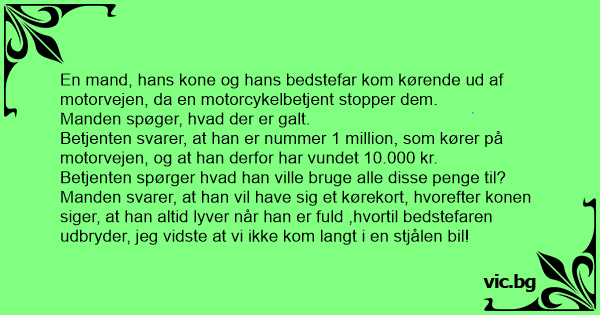 Manden svarer, at han vil have sig et kørekort, hvorefter konen siger, at han altid lyver når han er fuld ,hvortil bedstefaren udbryder, jeg vidste at vi ikke kom langt i en stjålen bil!