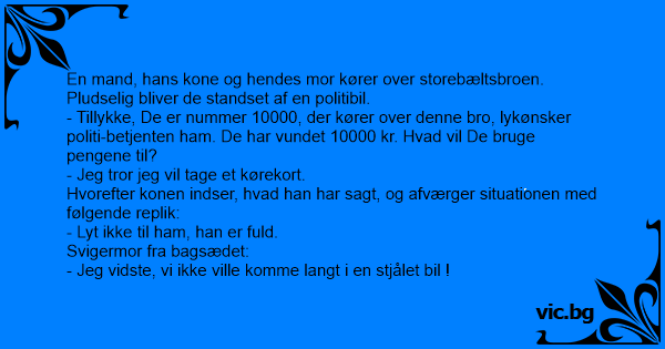 - Tillykke, De er nummer 10000, der kører over denne bro, lykønsker politi-betjenten ham. De har vundet 10000 kr. Hvad vil De bruge pengene til?
