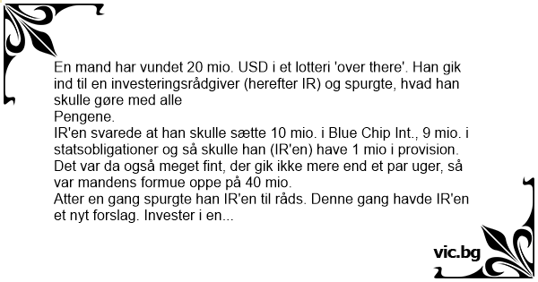 En mand har vundet 20 mio. USD i et lotteri 'over there'. Han gik ind til en investeringsrådgiver (herefter IR) og spurgte, hvad han skulle gøre med alle
