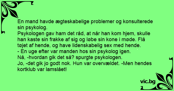Psykologen gav ham det råd, at når han kom hjem, skulle han kaste sin frakke af sig og løbe sin kone i møde. Flå tøjet af hende, og have lidenskabelig sеx med hende.