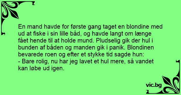 En mand havde for første gang taget en blondine med ud at fiske i sin lille båd, og havde langt om længe fået hende til at holde mund. Pludselig gik der hul i bunden af båden og manden gik i panik. Blondinen bevarede roen og efter et stykke tid sagde hun: