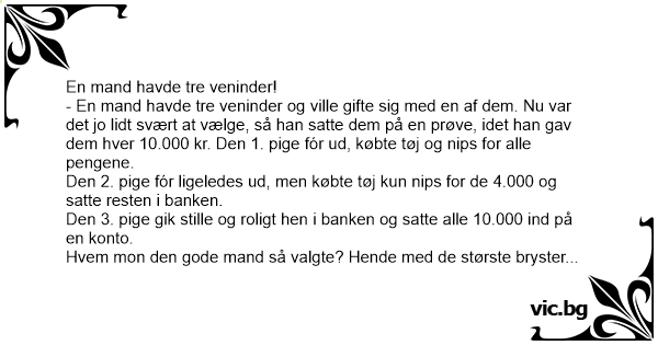 - En mand havde tre veninder og ville gifte sig med en af dem. Nu var det jo lidt svært at vælge, så han satte dem på en prøve, idet han gav dem hver 10.000 kr. Den 1. pige fór ud, købte tøj og nips for alle pengene.