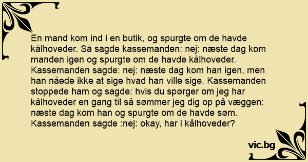 En mand kom ind i en butik, og spurgte om de havde kålhoveder. Så sagde kassemanden: nej: næste dag kom manden igen og spurgte om de havde kålhoveder. Kassemanden sagde: nej: næste dag kom han igen, men han nåede ikke at sige hvad han ville sige. Kassemanden stoppede ham og sagde: hvis du spørger om jeg har kålhoveder en gang til så sømmer jeg dig op på væggen: næste dag kom han og spurgte om de havde søm. Kassemanden sagde :nej: okay, har i kålhoveder?