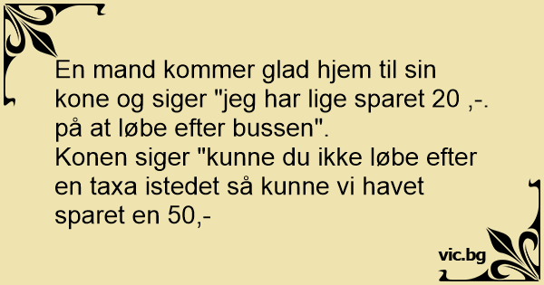 En man sa till sin fru: - Vet du, jag sparade 50 kr i dag, jag sprang efter bussen. Frun sa: - Dummer, om du hade sprungit efter taxin så hade du sparat 100 kr!!!