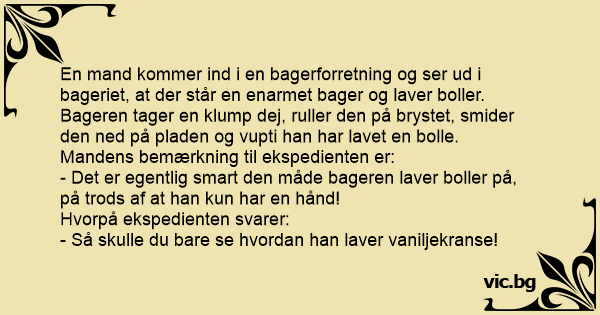 En mand kommer ind i en bagerforretning og ser ud i bageriet, at der står en enarmet bager og laver boller. Bageren tager en klump dej, ruller den på brystet, smider den ned på pladen og vupti han har lavet en bolle.