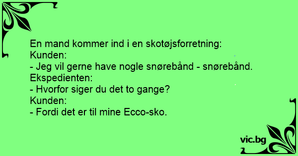 En mand kommer ind i en skotøjsforretning: Kunden: - Jeg vil gerne have nogle snørebånd - snørebånd. Ekspedienten: - Hvorfor siger du det to gange? Kunden: - Fordi det er til mine Ecco-sko.