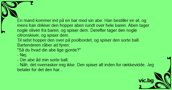 En kille kom in i baren med en apa på axeln. - Ni får akta er för hårbollen, sa killen, han äter allt i sin väg. Just i det ögonblicket hoppade apan upp på biljardbordet, stoppade en av bollarna i...